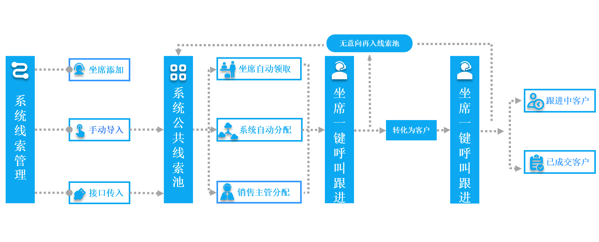2.?坐席對客戶線索進(jìn)行初次溝通篩選,通過系統(tǒng)一鍵呼叫功能發(fā)起外呼聯(lián)系客戶